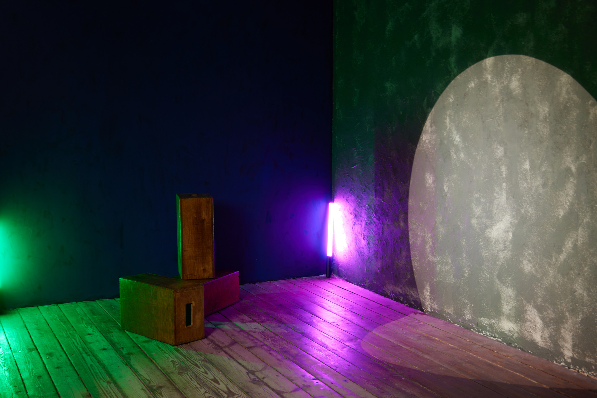 Balta ciklorāma, melna siena, pelēka reljefa siena, zila siena.